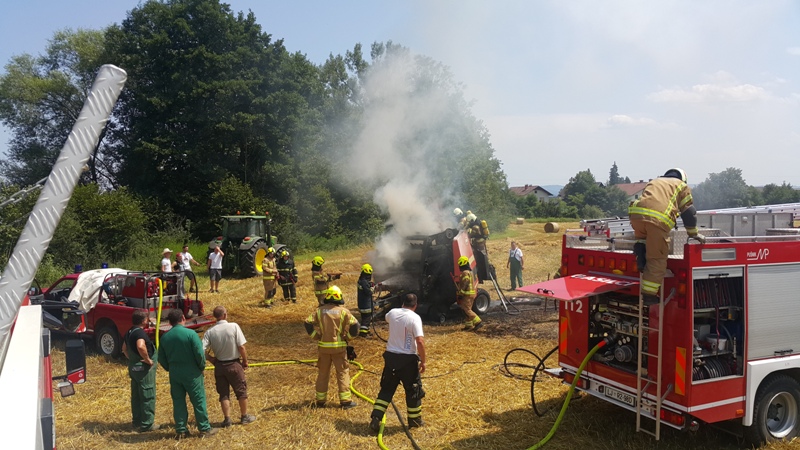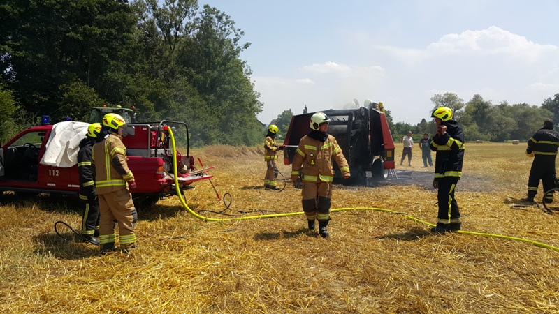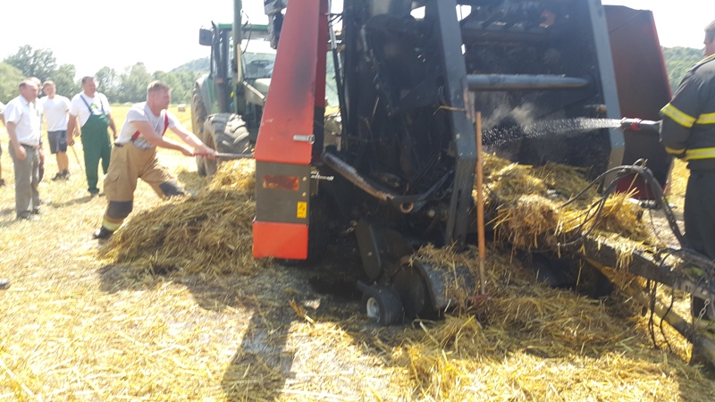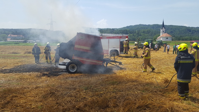 V petek, 21.7.2017 ob 13.33 uri smo bili preko ReCO Ljubljana obveščeni o požaru na balirnem stroju. Balirni stroj je zagorel na polju ob Grajski cesti v Jabljah. Izvozili smo z GVGP-1 in GVC 16/25 ter 6 operativnimi gasilci. Na kraju intervencije smo skupaj z gasilci PGD Mengeš in PGD Topole balirni stroj pogasili, balo sena razkopali in vse zalili z vodo ter pregledali s termo kamero. Kmetijski stroj je bil v požaru poškodovan. Intervencija je bila končana ob 15. uri.