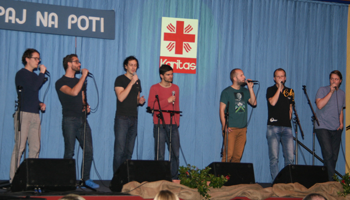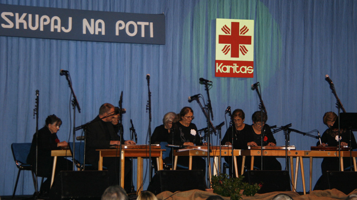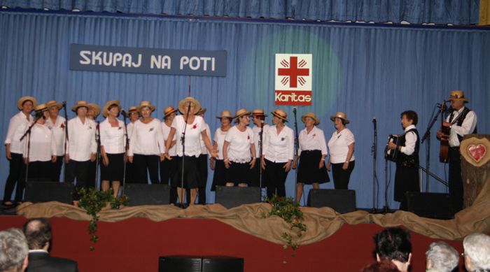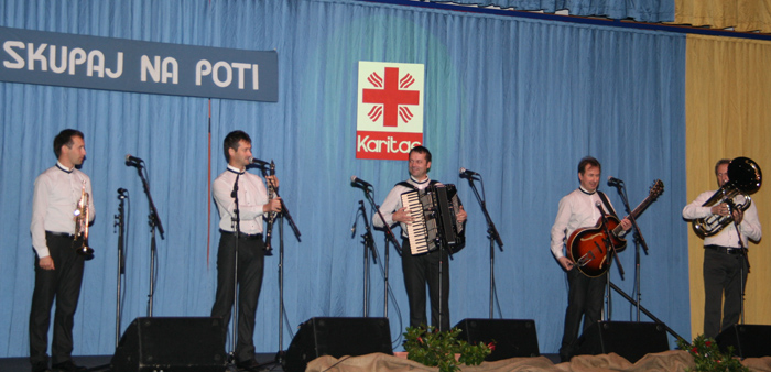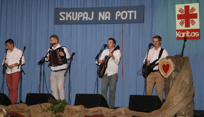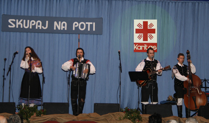 S pesmijo, katero so premierno predstavili pred štirimi leti na koncertu Karitas in dvema njihovima novejšima, se nam je predstavil ansambel Anžeta Šuštarja. preden je na oder stopil msgr Alojz Uran, smo prisluhnili še Manci Izmajlovi z znano Ave Marija. Slednji nam je v uvodu spregovoril o nedavnem potovanju s svojimi nekdanjimi sošolci v Sarajevo, na obisk k sošolcu, kjer je izvedel mnogo stvari še iz časov, ko je tam potekala vojna in iz povojnega časa, ko je bilo tam veliko pomanjkanje in v katerem se je izkazala s svojo pomočjo Slovenska Karitas, ki je v materialnih stvareh pomagala, da so lahko ljudje dobili osnovne stvari. Msgr. Uran je v nadaljevanju dejal: Jezus je rekel, uboge boste imeli vedno med seboj. Tudi, če bo vse še tako urejeno, bo potrebna tista srčna dobrota, ki jo vidi samo človek, ki gleda s srcem. In križ, ki je tudi simbol Karitasa, je osvetljen. In kdo ga osvetljuje? Dobrota in ljubezen. Zato ima Karitas dodano vrednost pri svojih prizadevanjih, ker vedno znova lahko črpa svojo pot za poslanstvo, pot svojega Očeta, ker vsi ljudje imamo enega Očeta, ki nas ima rad, ki nas je ustvaril in ki si želi, da bi se enkrat srečali pri njem. Na koncu je dodal še piko na i svojemu nagovoru, saj ga je zaključil s pesmijo, ki pravi, da On ve, kaj v srcu skrito je…