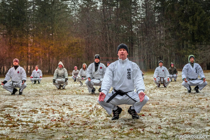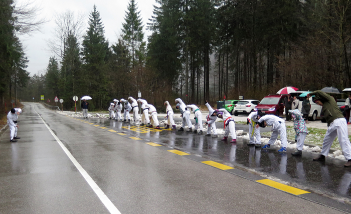 Prvi januar, 2018, Kamniška Bistrica. Karate trening v vsakem vremenu. In je bil. V močnem dežju se je v Kamniški Bistrici, na novega leta dan, tradicionalno zbrala večja skupina karateistov, vseh starosti, si voščila zdravja in sreče, pričakala tradicionalno skupino tekačev, ki so se korajžno podali na čofotanje, v ne preveč hladno izvirsko vodo. Res junaki, da jim ni para.