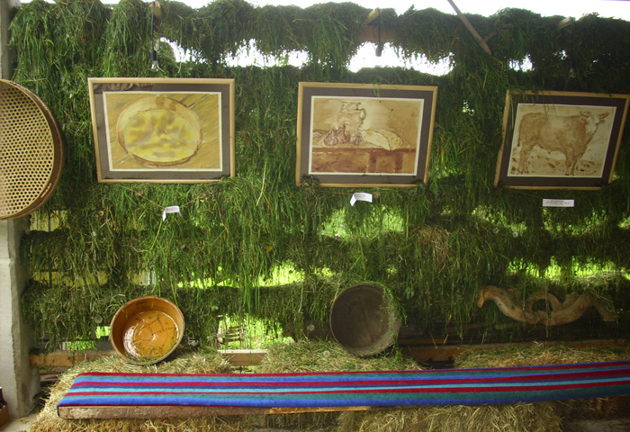 Vsa razstavljena dela so bila ustvarjena v akvarel tehniki z naravnimi materiali, z vinom, kisom in radensko. Del razstave so mu pomagale pripraviti sošolke slikarske šole, ki so v stara trodelna okna slikale različne motive.