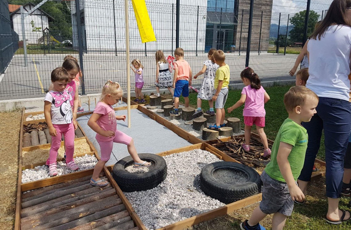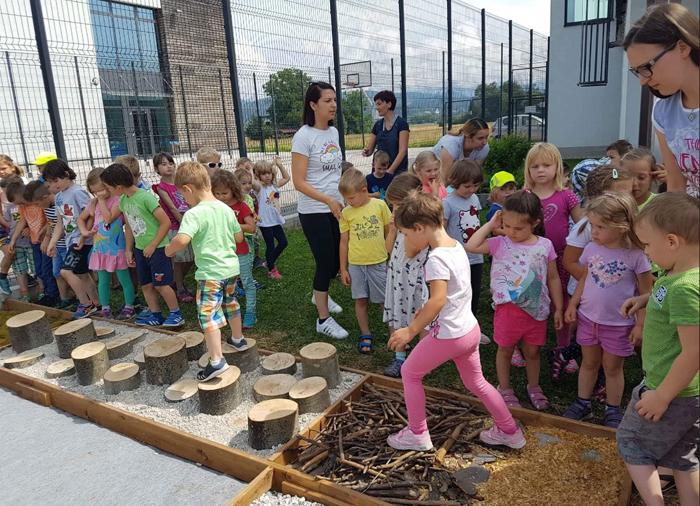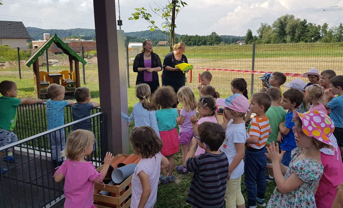 Sledila je otvoritev Čutne poti na igrišču. Da pa je bila otvoritev taka kot jo vidimo na najimenitnejših otvoritvah, smo v zasedbi odraslega Mavričnega zbora zapeli pesmi o Lipi, o drobnih ptičkah ter malih sončkih.