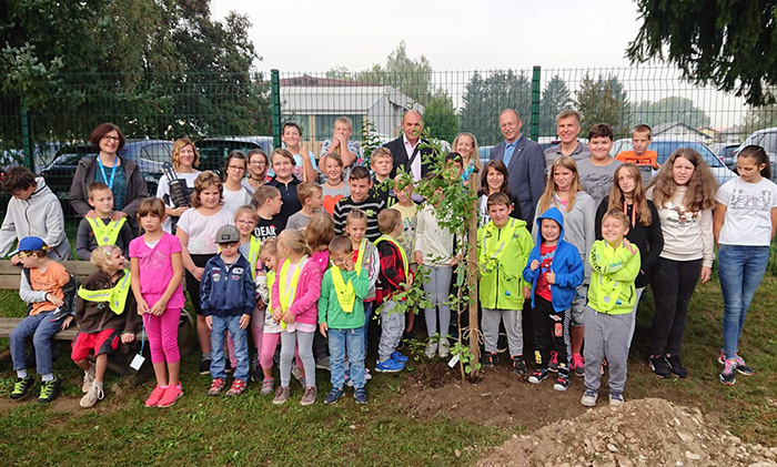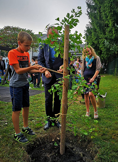 Po uvodnem pozdravu je besedo prevzela ga. Andreja Škrlj, v.d. ravnatelja, ki je poudarila pomen ohranjanja narave in skrbi za okolje, hkrati pa se je ponovno zahvalila g. Janku Velkavrhu in Rotary Klubu Domžale, ki so pomagali pri prenovi šolskega igrišča in s tem zagotovili učencem prostor za sproščanje in igro hkrati pa omogočili šoli, da igrišče uporablja kot učilnico na prostem. G. Velkavrh je pred posaditvijo nagovoril učitelje in učence, nam vsem zaželel uspešno šolsko leto ter izrazil zadovoljstvo nad skupnim sodelovanjem in tem, da je bil njihov projekt prenove tako uspešen. Po aplavzu je učitelj Slavko Lenaršič skupaj z g. Velkavrhom in otroki posadil drevo ginko, otroci 4. in 5. razreda pa so zapeli šolsko himno o sajenju dreves. Drevo nas bo na šolskem igrišču opominjalo na dobro sodelovanje in prijateljstvo ter nam, ko bo zraslo, zagotovilo senco pri igranju, z njegovimi listi pa bomo obogatili zbirko domačih zelišč in čajev!