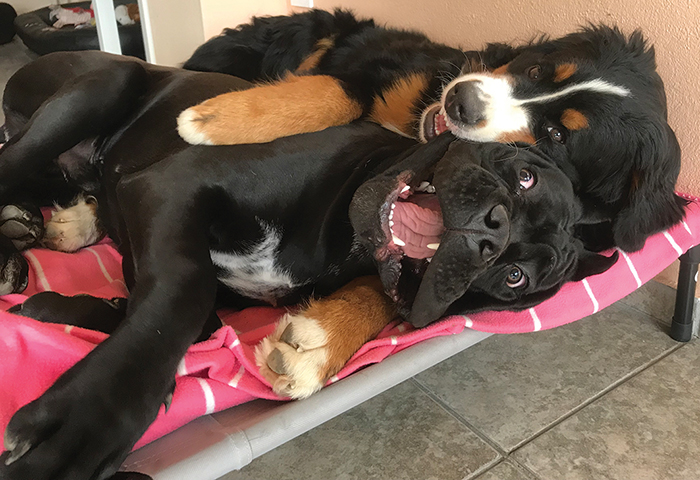 Sama imam tri psičke, bernske planšarke. Najstarejša je osemletna Bibi, sledi ji sedemletna Paris in še najmlajša, skoraj dve leti stara Lumi, Bibina hčerka, ki sem jo obdržala doma iz zadnjega legla.