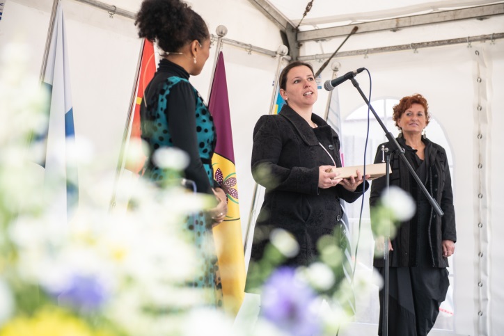 Irena Yebuah Tiran z direktorico Marjeto Stražar s čestitkami avtorici zmagovalnega filma Ireni Režek ob razglasitvi rezultatov natečaja Življenje v kapljici vode in ob nastopu v duetu z Evo Hren.