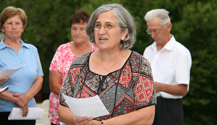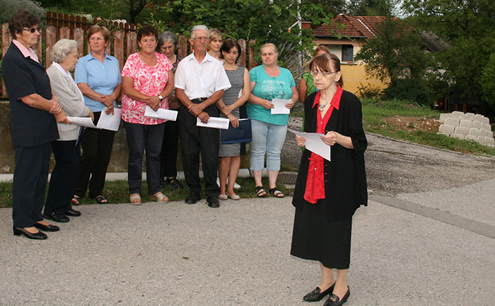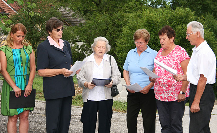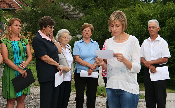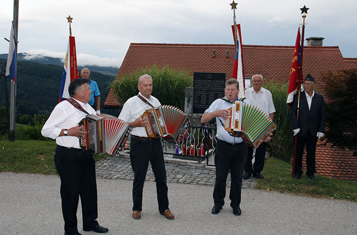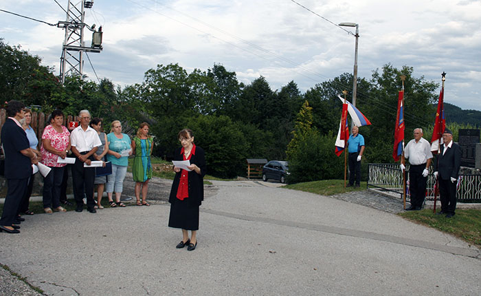 Zgodovinsko plat dogodkov pred 77 leti je opisala Vera Beguš in se zahvalila vsem , ki so tokrat prišli počastit spomin vseh tistih, ki spijo v grobu na začetku vasi. Ob tem je spregovorila o vasi v tistih časih in danes in o ljudeh, so v vasi, ki so prijatelji in se znajo družiti in eden drugemu pomagati. Z minuto molka smo počastili padle, nato pa prisluhnili kulturnemu programu, v katerem so sodelovali ljudski pevci in recitatorke KUD Fran Maselj Podlimbarski. O domovini, o požganih vaseh, o črnih avtomobilih in še o čem je tokrat tekla beseda recitatork. Vmes je zadonela pesem, pesem, ki jo poznamo še iz mladih let in ni pozabljena še danes. Miro, Srečo in Tone so na plan privlekli mašinco in to ne navadno ampak frajtonerco in urezali tisto znano partizansko Hej brigade, ter Kovači smo kar med potjo do kozolca, kjer je potekalo družabno srečanje in to kakšno. Pričel se je namreč prijetnejši del ob klobasi, pivu Rokovnjač in pesmi. Starejši so obujali spomine, mlajši pa prisluhnili pesmim, ki jih ne poznajo, kaj šele znali zapeti.