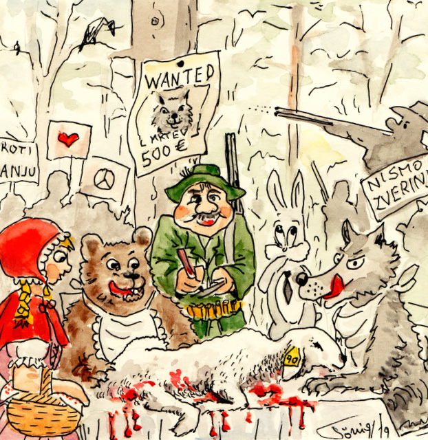 V mali deželici imamo velike probleme. Tako kot ima, recimo neka žival, velike oči, velika usta in velike zobe. Vsaj tako nam govori pravljica, v kateri hudobni volk poje, nič hudega slutečo, deklico z rdečo kapico. Ta deklica brezskrbno tava po gozdu in ker je hudobni volk pač lačen, si jo privošči za sladico, pred tem pa pomalica še njeno babico. Tako pač je, volk je zverina in zverine pomalicajo tisto, kar dobijo na pladnju. No, hvala bogu, v tej naši pravljici obstaja tudi pogumni lovec, ki na koncu poskrbi za to, da zverina plača svojo hudobijo in nato vsi skupaj srečno živijo do konca svojih dni…Tako je v pravljici, pri nas, v resničnem svetu, pa imamo z volkovi bolj resne probleme. Volkovi koljejo drobnico in domače živali, rejci hočejo, da se volkove izbriše z njihovega območja, lovci veselo polnijo svoje puške, naravovarstveniki bijejo plat zvona, stranka, zavezana ljudstvu, pa je bila za vsak odstrel pripravljena plačati celo 500 evrov. No, vsaj tega na koncu ni več, saj so si zaradi odziva javnosti premislili, kar pa ne pomeni, da zmeda še vedno ni popolna. Seveda je osnovno vprašanje KDO IMA PRAV?! Rejci živine ali naravovarstveniki? In tako, kot se za demokracijo spodobi, v tem sporu razsoja politika, ki, roko na srce, o zadevi nima pojma, ampak nekdo pač mora razsoditi. In tako je politika birokratsko sprejela številke o odstrelu kopice volkov in stotnije medvedov. Zadovoljen ni nihče, naravovarstveniki svarijo pred porušenjem ravnovesja in dolgoročno nevarnostjo izumrtja oziroma izginotja volka z našega območje, rejci pa bodo še naprej trepetali za svoje ovčice, ki bodo še vedno na jedilniku tako volka kot medveda. Tako pač je, oba sta na vrhu prehranjevalne verige in nimata naravnega sovražnika. No ja, pozabili smo na politike…. Oni so tisti, ki so napolnili puške lovcem.