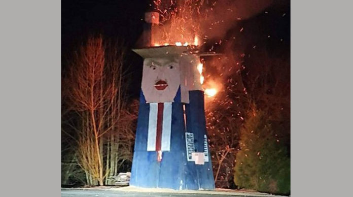 Osem metrov visoko skulpturo, ki spominja na ameriškega predsednika Donalda Trumpa, so člani Športnega in kulturnega društva Sela avgusta lani postavili pri gasilskem domu v Selih pri Kamniku.