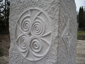 »To je skulptura, namenjena temu parku; na njej so upodobljena znamenja, ki niso običajna, ampak gre za nekaj več: to je metoda akupunkture prostora, skulpturja iz lipiškega kamna je postavljena na geomanitčno vozlišče kraja in podpira identiteto prostora. Vzorci na njej prikazujejo značilnosti parka, ki pa nimajo zgolj samo likovne oblike, ampak imajo tudi svojo posebno energijo. Pomembno je, da se najprej doseže neko empatijo s prostorom in šele potem sem lahko izdelal te kozmograme, ki so na skulpturi. Beseda kozmogram je sestavljena iz korena besede ‘kozmos’ kar pomeni svetovni red, ‘gram’ pa pomeni besedo ali pismenko. Narejeni so na osnovi neprekinjene črte in predstavlja večno kroženje v naravi, za to točko je pomembna povezanost, zato je bilo naše razmišljanje, da park odpremo mestu. Sama geometrija znamenj je izdelana tako, da drži ravnotežje različnih polarnosti; gre za dekodiranje različnih naravnih danosti v prostoru, potem se izdela kodiranje določenega arhetipa v kamen.«