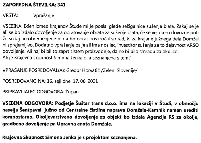 Zeleni Slovenije zaupamo tehnologiji predelave komunalnega blata (19 08 05), rešiti je torej potrebno problem prometa skozi naselja, kar predstavlja po mojem mnenju še največji problem. Nujen je torej neposreden izvoz na avtocesto. izdelana mora biti presoja vplivov na okolje, pridobljeno mora biti soglasje ARSO in šele nato lahko UE Domžale izda gradbeno dovoljenje in seveda strinjanje z vsem tem tamkajšnjih prebivalcev.