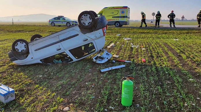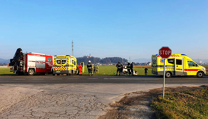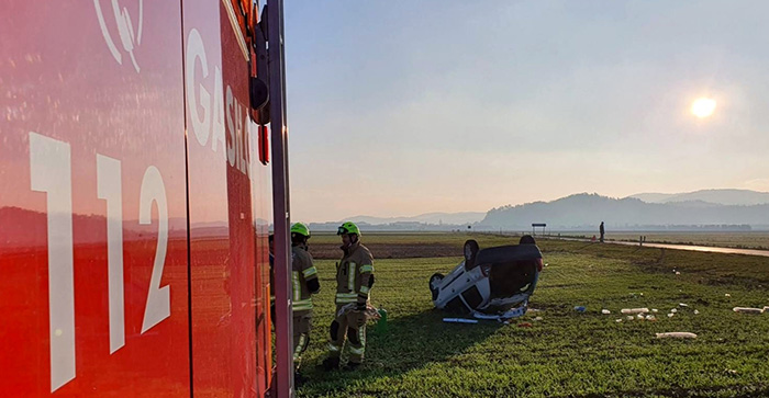 Na regionalni cesti Mengeš–Duplica se je vozilo prevrnilo na streho. V njem ostal ukleščen voznik