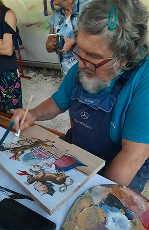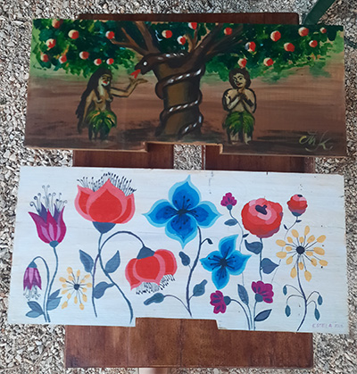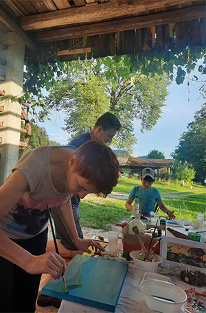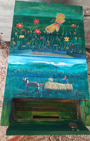 Pod Ožbovčevim lesenim kozolcem toplarjem, ki je značilna odprta stavba za sušenje žita in trave, so nas čakali panji, deščice, panjske končnice, barve in zadovoljen nasmejan obraz čebelarja Boštjana. Slikarski dogodek se na domačiji pri Ožbovčevih odvija drugič in kot pravi ljudski rek »če bo bog dal zdravje in voljo« bo lahko v prihodnje postal naš tradicionalni slikarski dogodek. Na dva sončna ponedeljka v juniju smo se veseljem odzvali povabilu čebelarja g. Boštjana Romšaka. V pristni naravi v okolju obdanem s kmetijo, kjer je povsod zelenje, kjer vseskozi vije prijaznost, preprostost in domačnost, smo pričeli z slikarskih delom. Panje in panjske končnice smo poslikali z znanimi ljudskimi motivi. Izbrali smo motive , ki ponazarjajo zgodbe iz vsakdanjega življenja, kot so opravila na kmetiji in tudi posvetne satirične motive. Med poslikavami na deščice je nastala tudi poslikava »Hudič babi jezik brusi ». Je upodobitev, ki izraža mnenje, da bi ženske ne mogle imeti ostrega jezika, kot ga imajo, če jim ga ne bi nabrusil sam hudič. Poslikana je bila tudi končnica z motivom Sv. Ambroža, ki je bil učitelj zavetnik čebelarjev in voskarjev. In poslikave Adame in Eve, Kralja Matjaža in še drugih motivov. Družina nas je vseskozi gostila s pijačo in z pristno dobro domačo malico. Slikanje in prijetno kramljanje z družino Romšak smo zaključili pozno v večer. Tako bo lahko čebelar Boštjan v svoj čebelnjak zložil nove poslikane živobarvne panje. Zahvaljujemo se družini Romšak za vso prijaznost, gostoljubnost in za darilo, za pravi domači med.