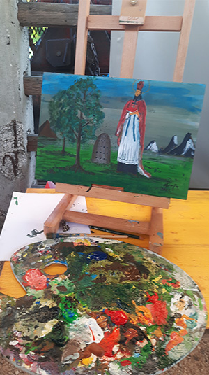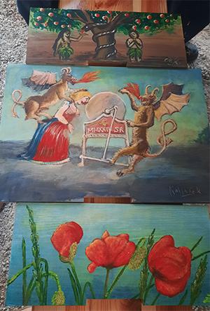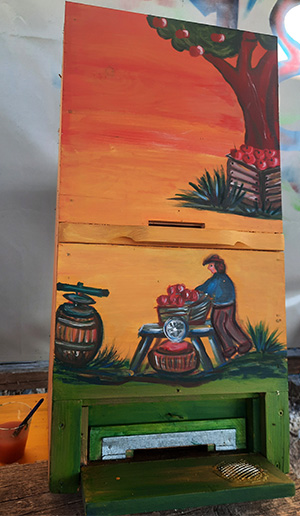 Pod Ožbovčevim lesenim kozolcem toplarjem, ki je značilna odprta stavba za sušenje žita in trave, so nas čakali panji, deščice, panjske končnice, barve in zadovoljen nasmejan obraz čebelarja Boštjana. Slikarski dogodek se na domačiji pri Ožbovčevih odvija drugič in kot pravi ljudski rek »če bo bog dal zdravje in voljo« bo lahko v prihodnje postal naš tradicionalni slikarski dogodek. Na dva sončna ponedeljka v juniju smo se veseljem odzvali povabilu čebelarja g. Boštjana Romšaka. V pristni naravi v okolju obdanem s kmetijo, kjer je povsod zelenje, kjer vseskozi vije prijaznost, preprostost in domačnost, smo pričeli z slikarskih delom. Panje in panjske končnice smo poslikali z znanimi ljudskimi motivi. Izbrali smo motive , ki ponazarjajo zgodbe iz vsakdanjega življenja, kot so opravila na kmetiji in tudi posvetne satirične motive. Med poslikavami na deščice je nastala tudi poslikava »Hudič babi jezik brusi ». Je upodobitev, ki izraža mnenje, da bi ženske ne mogle imeti ostrega jezika, kot ga imajo, če jim ga ne bi nabrusil sam hudič. Poslikana je bila tudi končnica z motivom Sv. Ambroža, ki je bil učitelj zavetnik čebelarjev in voskarjev. In poslikave Adame in Eve, Kralja Matjaža in še drugih motivov. Družina nas je vseskozi gostila s pijačo in z pristno dobro domačo malico. Slikanje in prijetno kramljanje z družino Romšak smo zaključili pozno v večer. Tako bo lahko čebelar Boštjan v svoj čebelnjak zložil nove poslikane živobarvne panje. Zahvaljujemo se družini Romšak za vso prijaznost, gostoljubnost in za darilo, za pravi domači med.