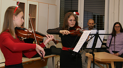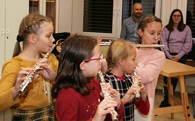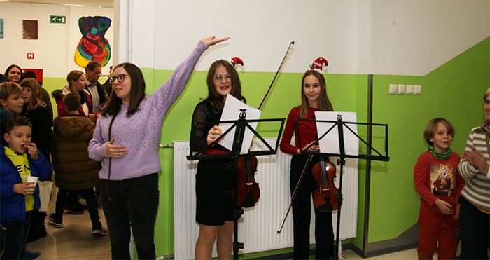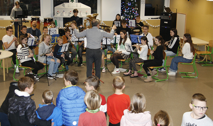 V četrtek, 24. novembra, so tako pripravili dan odprtih vrat šole, popestren z novoletnim bazarjem ali tržnico, ki so jo obiskali tako mladi kot stari. Da pa je bil bazar pester in poln raznovrstne ponudbe, gre zasluga tudi vsem učiteljicam in učiteljem in še komu. Ob pričetku dogajanja so zaigrali člani in članice pihalnega orkestra Brdis GŠ Domžale oddelka Brdo, ki ga vodi Tomaž Pirnat, kmalu zatem so okoli stojnic nastajala prava »mravljišča« obiskovalcev. Čestitke, piškoti, drobna, a uporabna darila…Vse to je dobilo nove lastnike, prav tako tudi knjige in igrače. Nekatere je zanimala poslikava obraza in potrebno se je bilo postaviti v vrsto, da si dobil na obraz smrekico, jelenčka ali kaj drugega. Ne, prav radi ne gremo k učiteljem in ostalim, ki so v službi v šoli, a tokrat se je pri njihovi stojnici kar trlo mladih, saj so imeli kokice, palačinke in še in še. Iz hodnika se je slišal zvok violine, ki je vabil na predstavitev inštrumentov GŠ Domžale. Ajda in Ema sta skupaj z učiteljico Ano povabili zbrane v učilnico, kjer so najmlajšim in tudi manj mladim predstavili inštrumente. Poleg kitare, tube, klarineta, flavte, velike in male pozavne, kontrabasa, violine in citer, je bil v živo predstavljen tudi vokal, zapela nam je namreč Patricija Štefan in tako predstavila tudi to plat poučevanja. Kar celo paleto trobil nam je predstavil Luka Einfalt in zanje navduševal tudi dekleta. Na vprašanje, kateri inštrument je najtežji, je Tomaž Pirnat odgovoril, da zagotovo klavir, saj bi ga zelo težko s seboj na vaje nosil. Prijeten popoldan na šoli je bil tako tudi glasbeno obarvan in za mnoge tudi poučen, saj so o tem in onem glede glasbe odgovarjali Ana Novak, Urška Urbanija Žun, Luka Einfalt in Tomaž Pirnat in z odgovori zagotovo navdušili koga, da se bo v prihodnjem letu priključil učencem in učenkam GŠ Domžale. V Domžalah, ali na Brdu.
