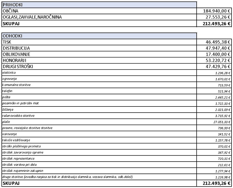 Končni znesek DRUGI STROŠKI (gostovanje v Kulturnemu domu Franca Bernika Domžale) občinskega glasila Slamnik so: 47.429,76 eur !!!
