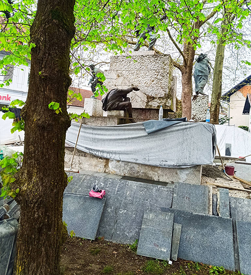 Restavriranje poškodb: Sanacija poškodovanih delov kamnitega podstavka in bronastih kipov.